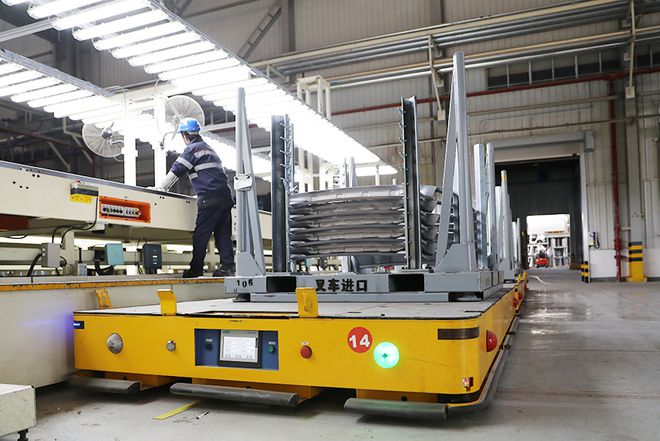 鋼板完成所有沖壓工序之后,都會(huì)經(jīng)過(guò)人工檢查,如果有問(wèn)題會(huì)交到返修部門(mén)。配合檢測(cè)的還有平行光檢測(cè)室,檢測(cè)頻率是50件/次,檢測(cè)合格的產(chǎn)品會(huì)由AGV小車運(yùn)往倉(cāng)庫(kù)。這種小車在其他車間同樣能夠見(jiàn)到,是個(gè)智能的自動(dòng)運(yùn)輸設(shè)備。